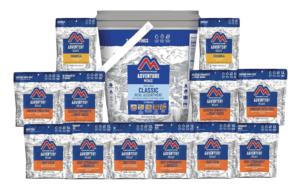 These meals can be whipped up in a matter of minutes. All that is needed is a bit of boiling water… no cooking required. I keep a couple of buckets on hand for each member of my household. It comes with 12 pouches totaling 24 servings of hearty meals like beef stew, chicken fried rice, and granola with milk and blueberries. The meals are lightweight, compact, and have a shelf life of up to 30 years, making them perfect for backpacking or long-term storage.